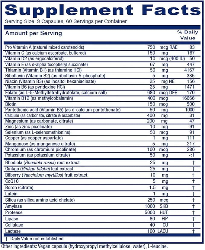 - This complete and thoughtful multiple vitamin/mineral complex addresses the common changes seen in the aging population, such as changes in calcium needs, cognition support, and digestion support. Features premium forms of nutrients and digestive enzymes promoting maximum absorption