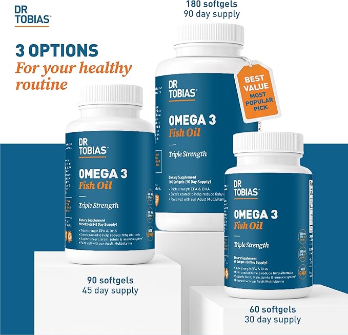 Dr. Tobias Omega 3 Fish Oil, 2000mg Triple Strength with 800mg EPA 600mg DHA Per Serving, Fish Oil Omega 3 Supplements for Heart, Brain & Immune Support, 180 Softgels, 90 Servings