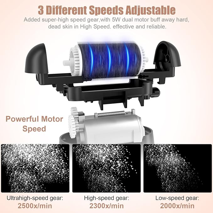 - 【3 Speeds Adjustable &3 Roller Heads】Electric foot file callus remover including 3 different quartz sand grinding heads, and have 3 speeds. Low speed is suitable for the callus of hands and more delicate skin care.High speed is suitable for newly formerd callus /daily skin care, Ultrahigh speed is suitable for stubborn thick callus and dead skin. It can easily to control, its speed as your request, fast or slow, more convenient.