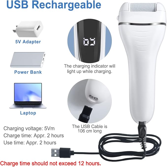 - LED Display & USB Charging Electric Foot File: High quality 1200mah large capacity lithium battery that shows the remaining charge. It comes with LED lighting so you can see what it is working on whether it's day or night. USB charging time is 4 hours for approximately 240 minutes of continuous operation. Notes: Please fully charge this product the first time you use it to protect its battery