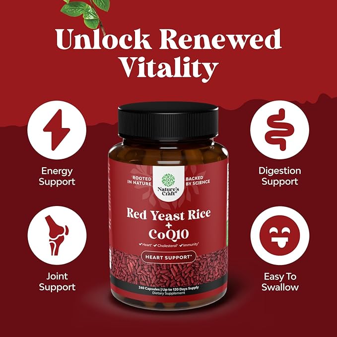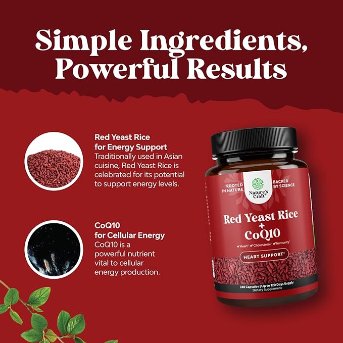 - SUPPORTS HEALTHY CHOLESTEROL & ENERGY LEVELS – Our red yeast rice 1200 mg capsules contain naturally occurring compounds that help keep healthy cholesterol levels, while CoQ10 supports healthy heart function, cellular energy production, and antioxidant protection.