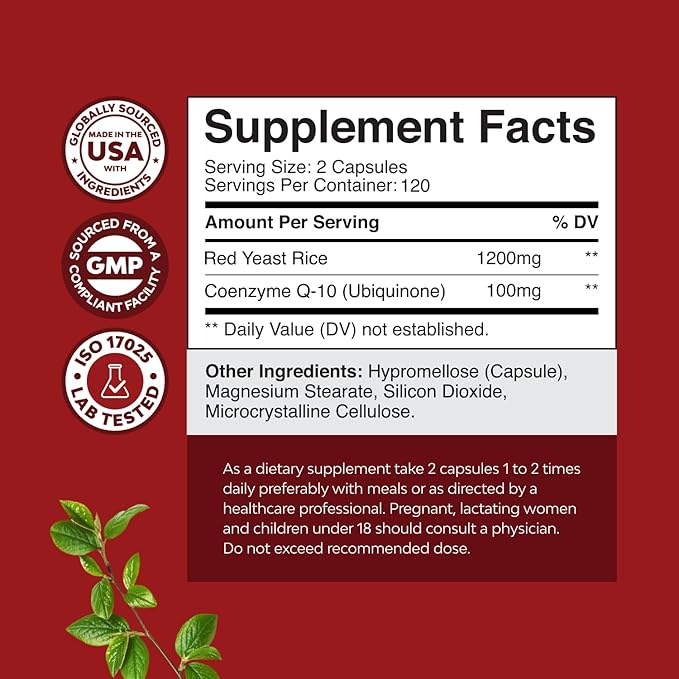 - MADE IN THE USA WITH GLOBALLY SOURCED INGREDIENTS – Our red yeast rice 1200 mg capsules with CoQ10 are manufactured in a GMP-compliant facility. It is vegan, non-GMO, third-party tested formula ensures purity, potency & safety for reliable daily healthy heart support.