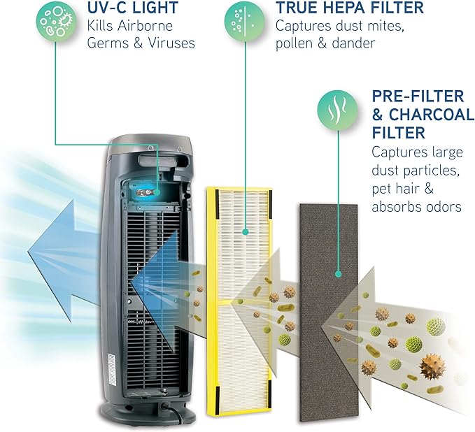 - FIGHTS GERMS: UV-C light helps reduce airborne bacteria, viruses, mold spores*, and works to reduce volatile organic compounds *Tested with Staphylococcus Albus, and Escherichia Coli, Aspergillus Niger, and Phi-X174