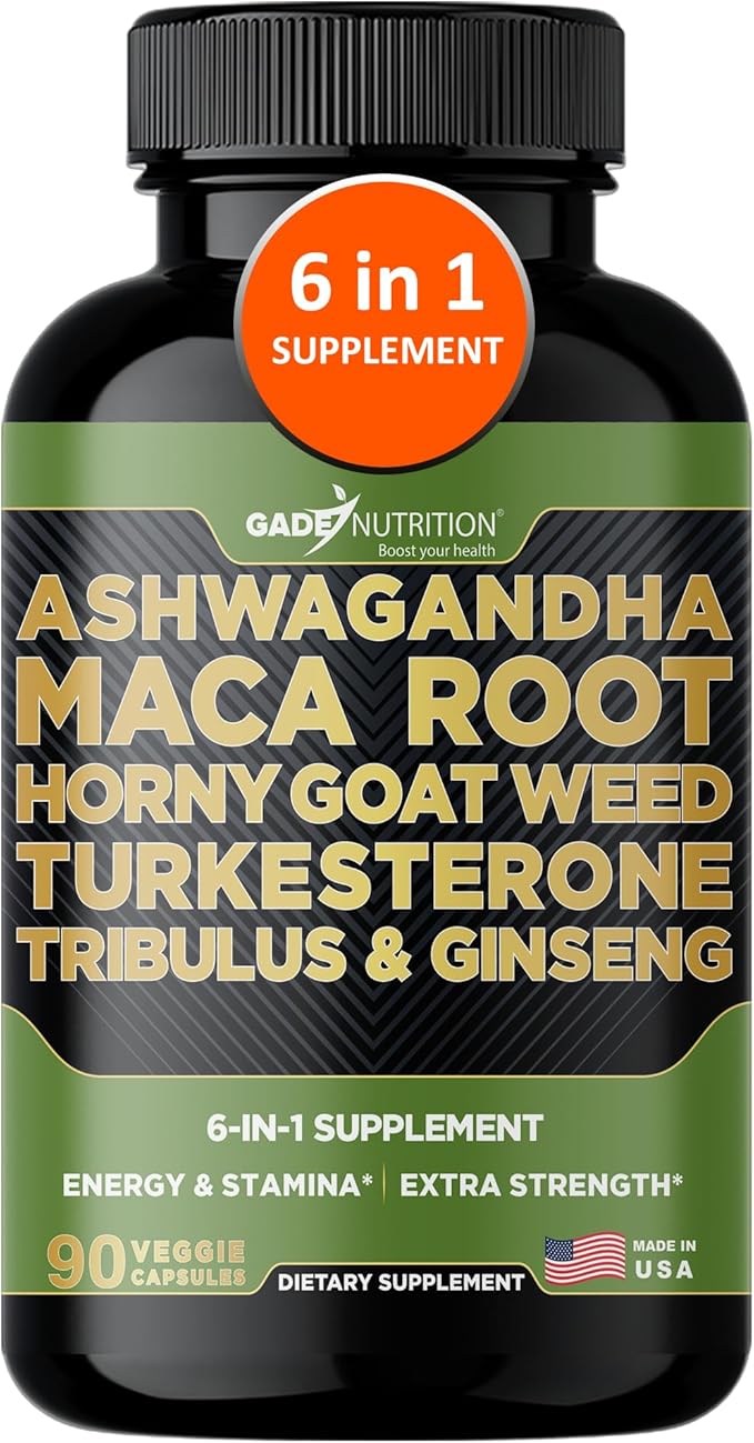 Gade Nutrition Ashwagandha with Maca Root, Horny Goat Weed, Turkesterone Supplement, Tribulus Terrestris, Panax Ginseng | 90 Vegetable Capsules for Energy, Stamina, Performance. | Made in USA