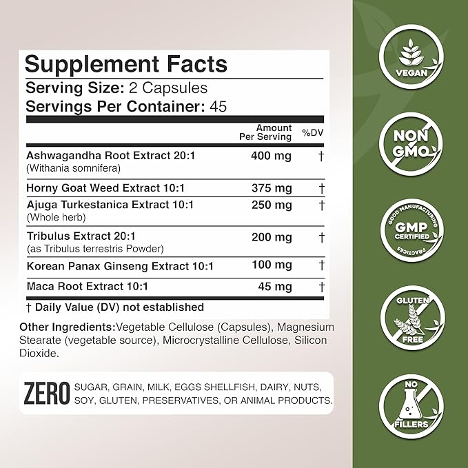 - ENERGIZE AND REVITALIZE NATURALLY: Step into every day feeling refreshed and focused with the natural support of Ashwagandha and Maca Root. Ginseng works to fuel your energy, while Tribulus Terrestris and Turkesterone enhance your physical performance. Whether you’re striving for fitness goals or maintaining day-to-day resilience, this blend is your ally for sustained energy and stamina.