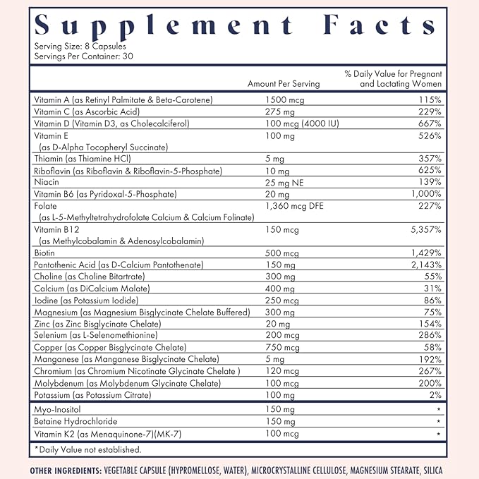 - REGISTERED DIETITIAN FORMULATED: Expertly formulated to fully cover your vitamin & mineral needs before, during, & after pregnancy. Key ingredients include folate, which helps support your baby's growth and heart development, choline, which helps with brain development & placental function, and vitamin D, which helps skeletal growth and development, healthy blood pressure levels, and baby's immune system. Combined, all of your nutritional bases are covered!
