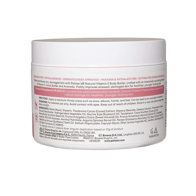 - Body Butter: Palmer's Natural Vitamin E Body Butter formula helps improve the appearance of dry, damaged or cracked skin, uneven skin tone and chafed skin; Improve the appearance of scars; Safe for sensitive skin