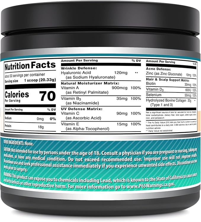 - 20 Grams per Serving Hydrolyzed Collagen with Hyaluronic Acid and Multivitamin Supplement