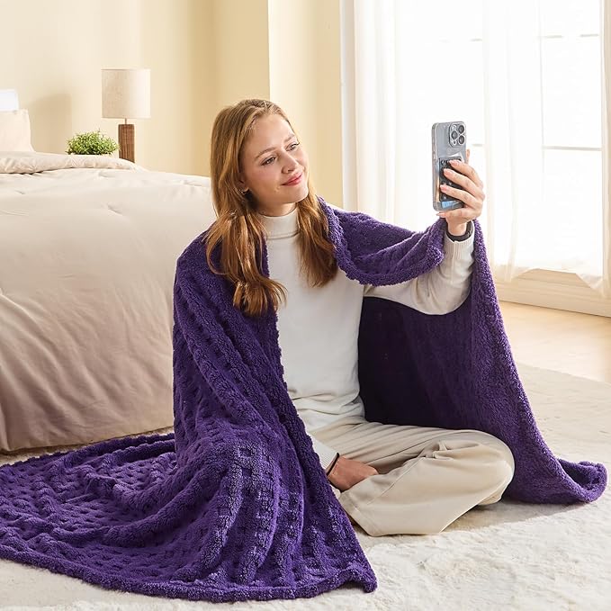NEWCOSPLAY Super Soft Queen Blanket Purple Premium Silky Flannel Fleece 3D Waffle Checkered Lightweight Bed Blanket All Season Use (Dark Purple, Queen(90"x90"))