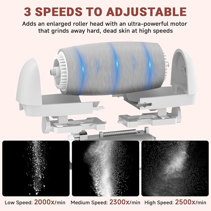 - 2500RPM/MIN MAX: The electric callus remover offers 3 speed settings—2000RPM, 2300RPM, and 2500RPM—to meet your foot care needs. Low speed is ideal for daily maintenance or lighter calluses, while medium and high speeds are better for thicker calluses. Long press to turn on/off and use the touch buttons to switch speeds.